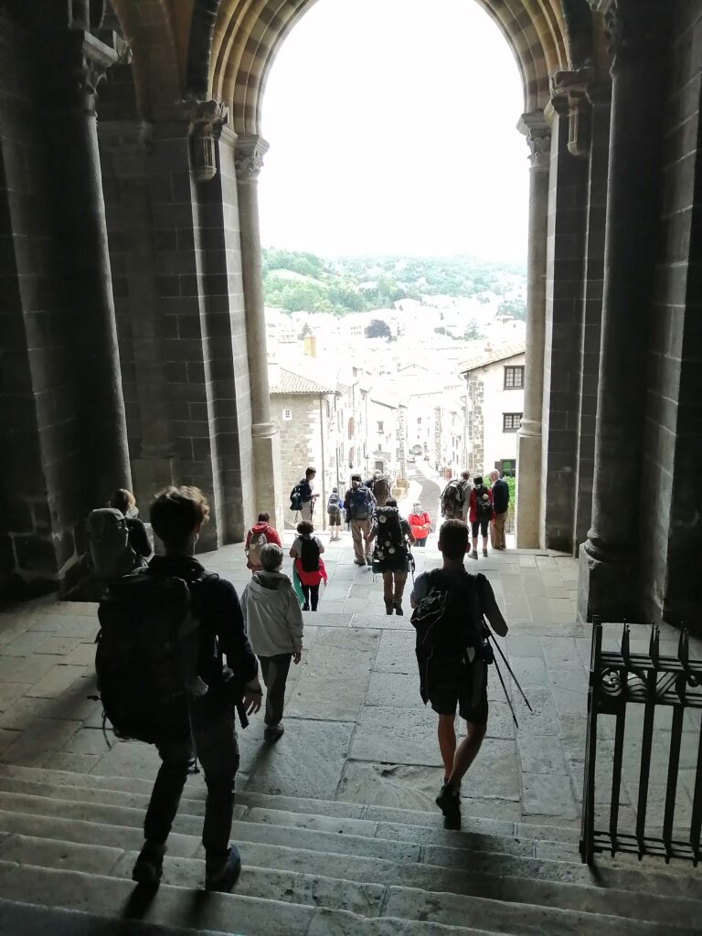 A tour de rôle pendant la semaine nous accompagnons les pèlerins à la messe de 7h pour assister à la bénédiction . Moment solennel, même pour les non croyants. Le prêtre sait apaiser les inquiétudes, et avec humour fédère tous ces marcheurs venus des 4 coins de France et du Monde : lorsqu’à la question s’il y a des étrangers dans l’assemblée seuls répondent les Allemands, Suisses, Belges, Américains, etc, il insiste en demandant s’il n’y a pas de Parisiens. Humour vellave !!